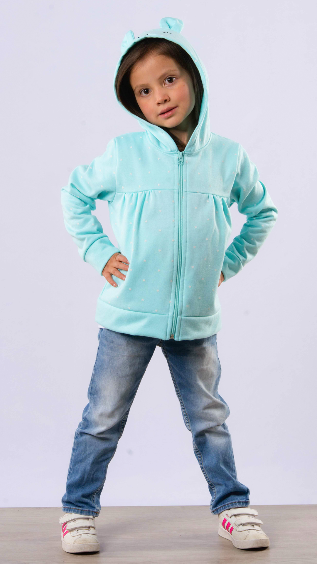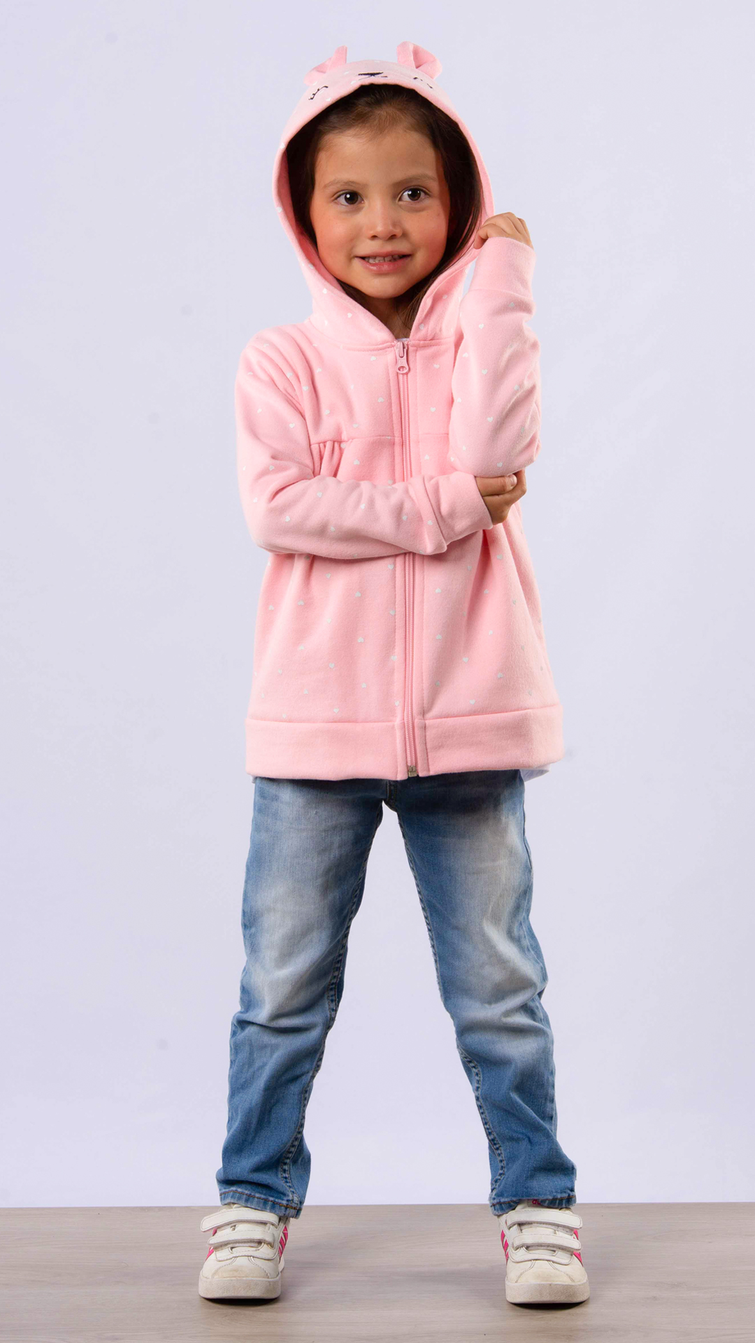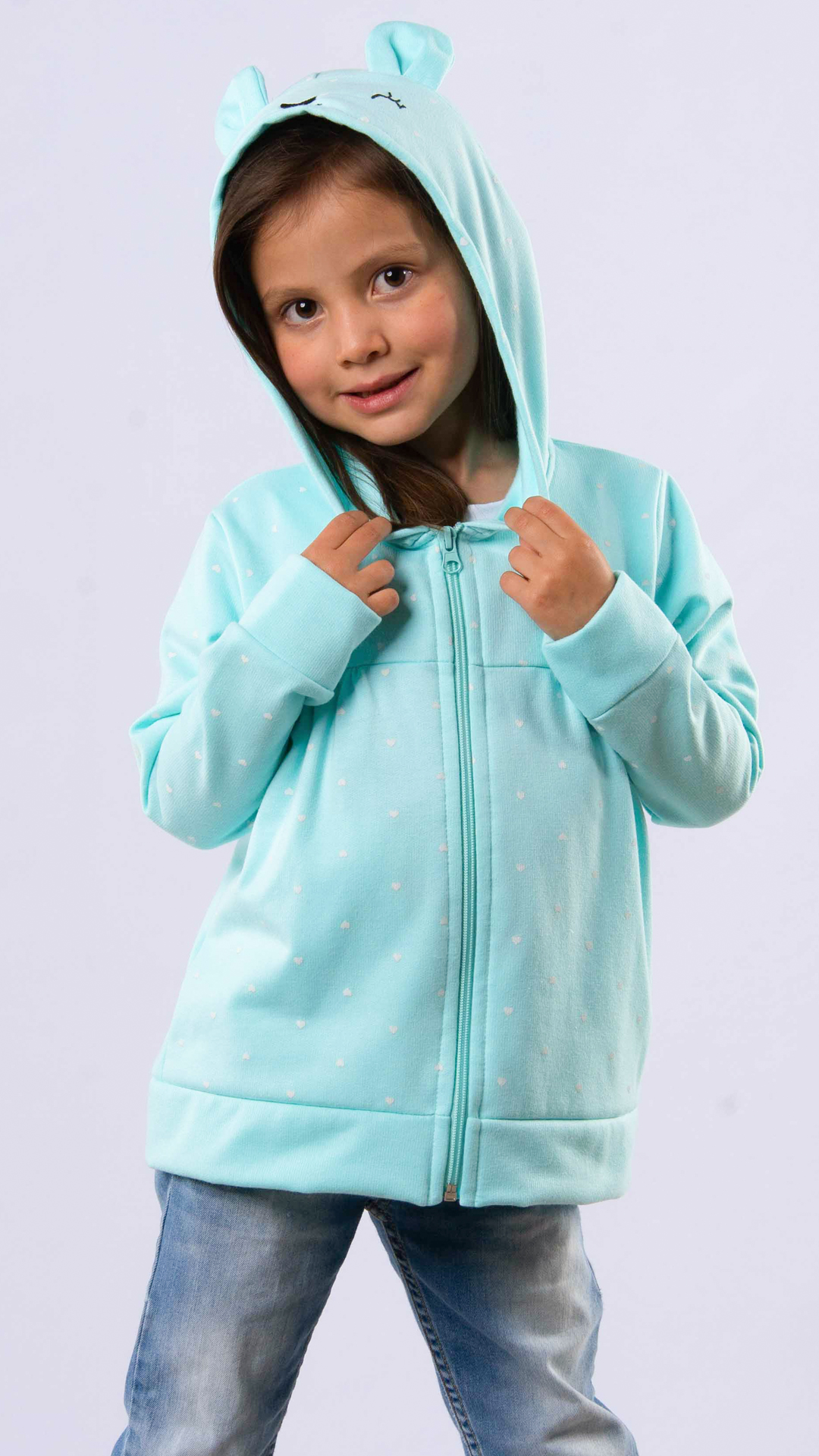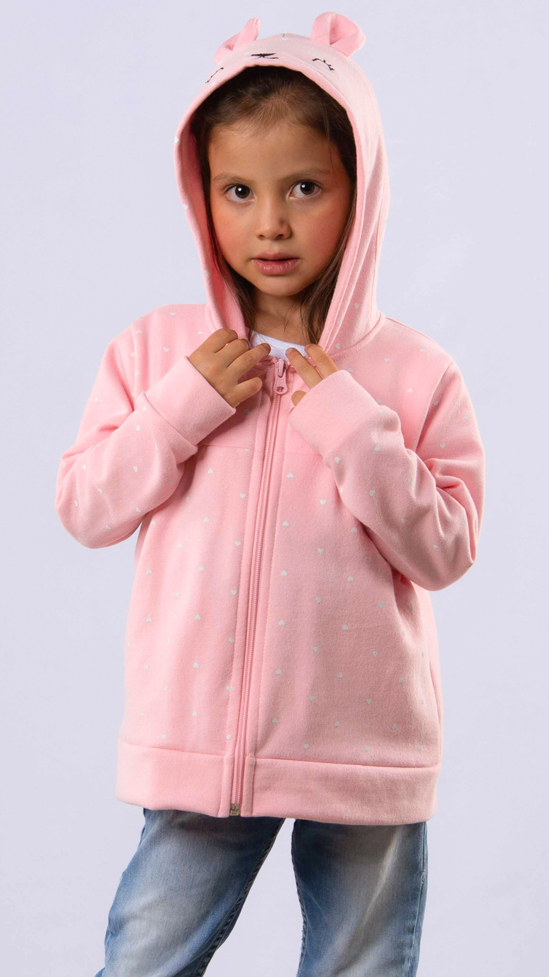 Chompa manga larga, capucha bordada con orejas y cierre frontal cremallera.