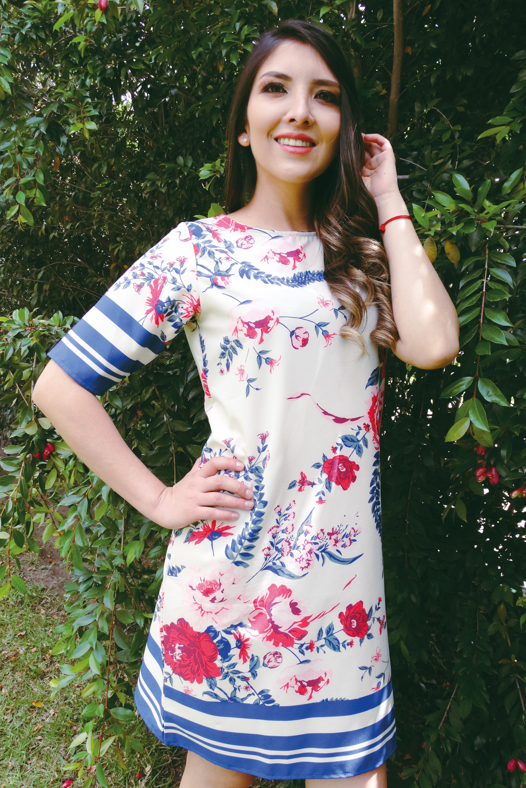 Vestido corto estampado digital cuello redondo y mangas cortas.
