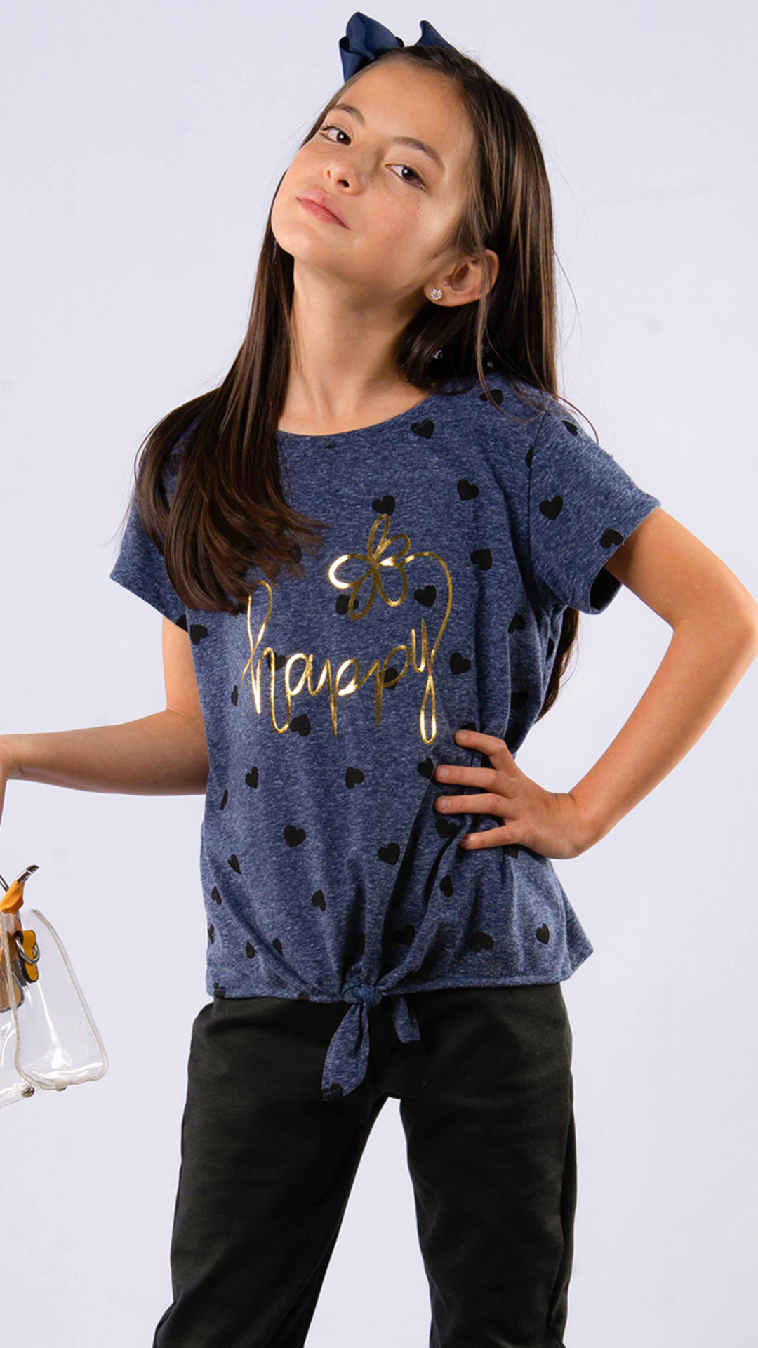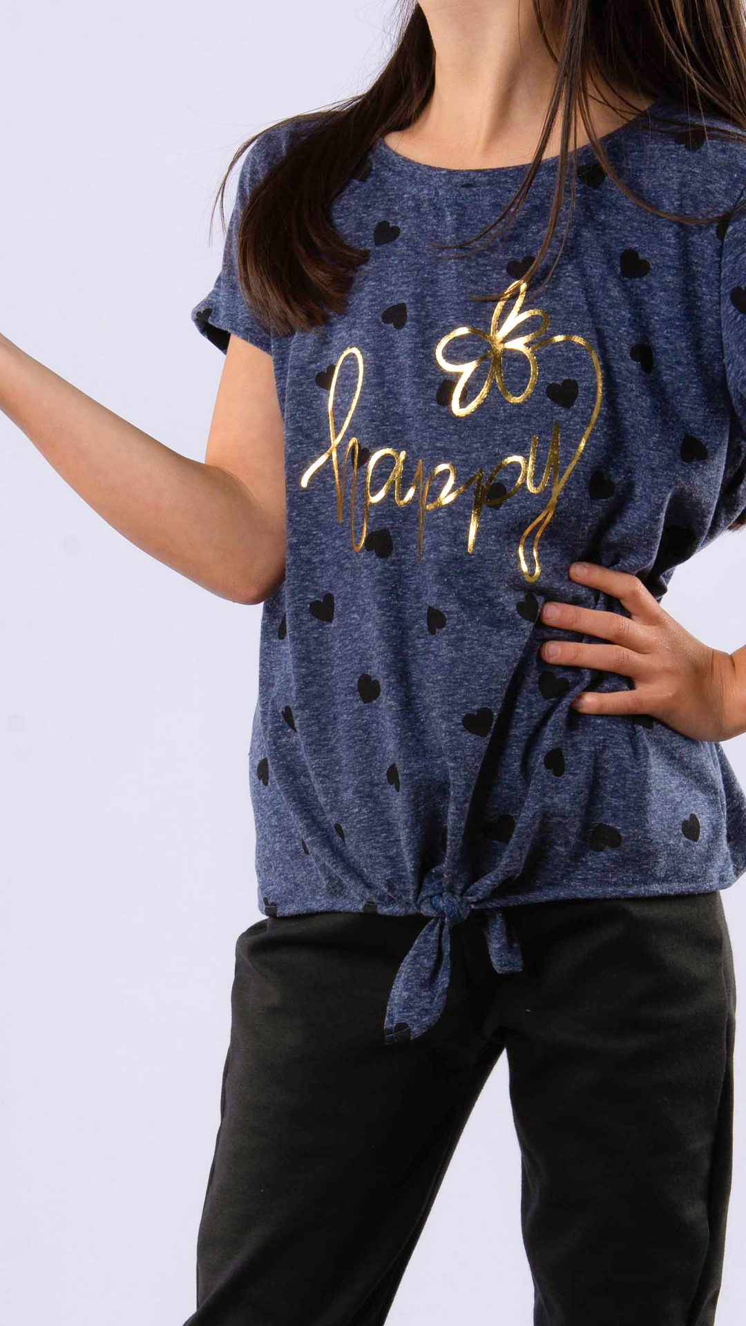 Blusa estampado texto manga corta con detalle de nudos en el bajo.