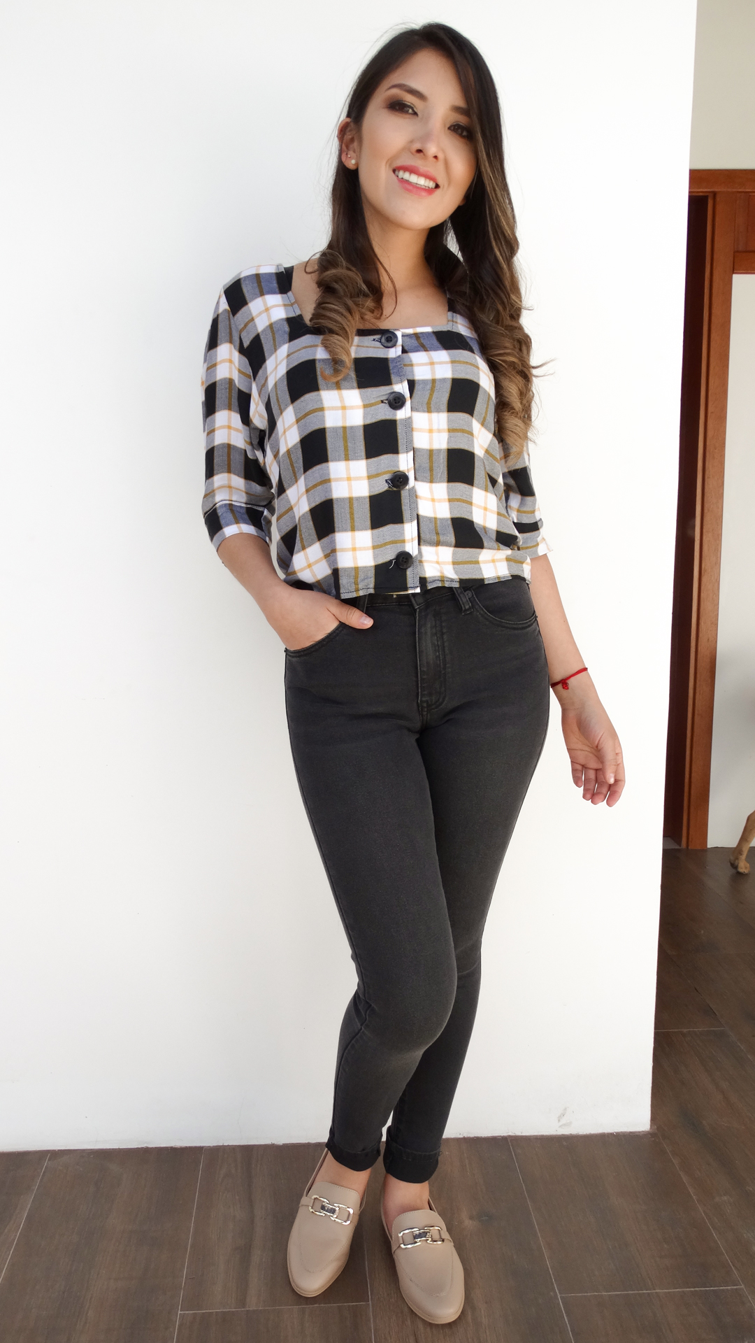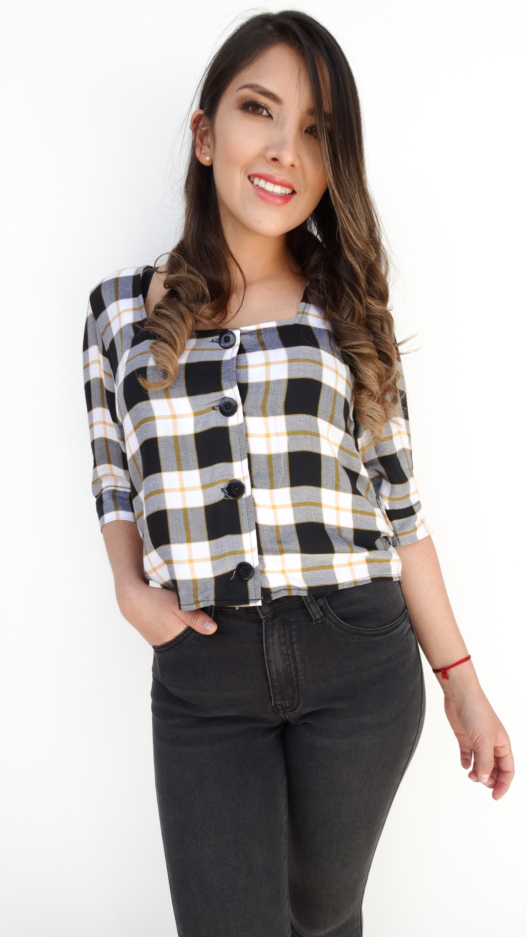 Blusa cuadros escote redondo cierre frontal con botones mangas 3/4.