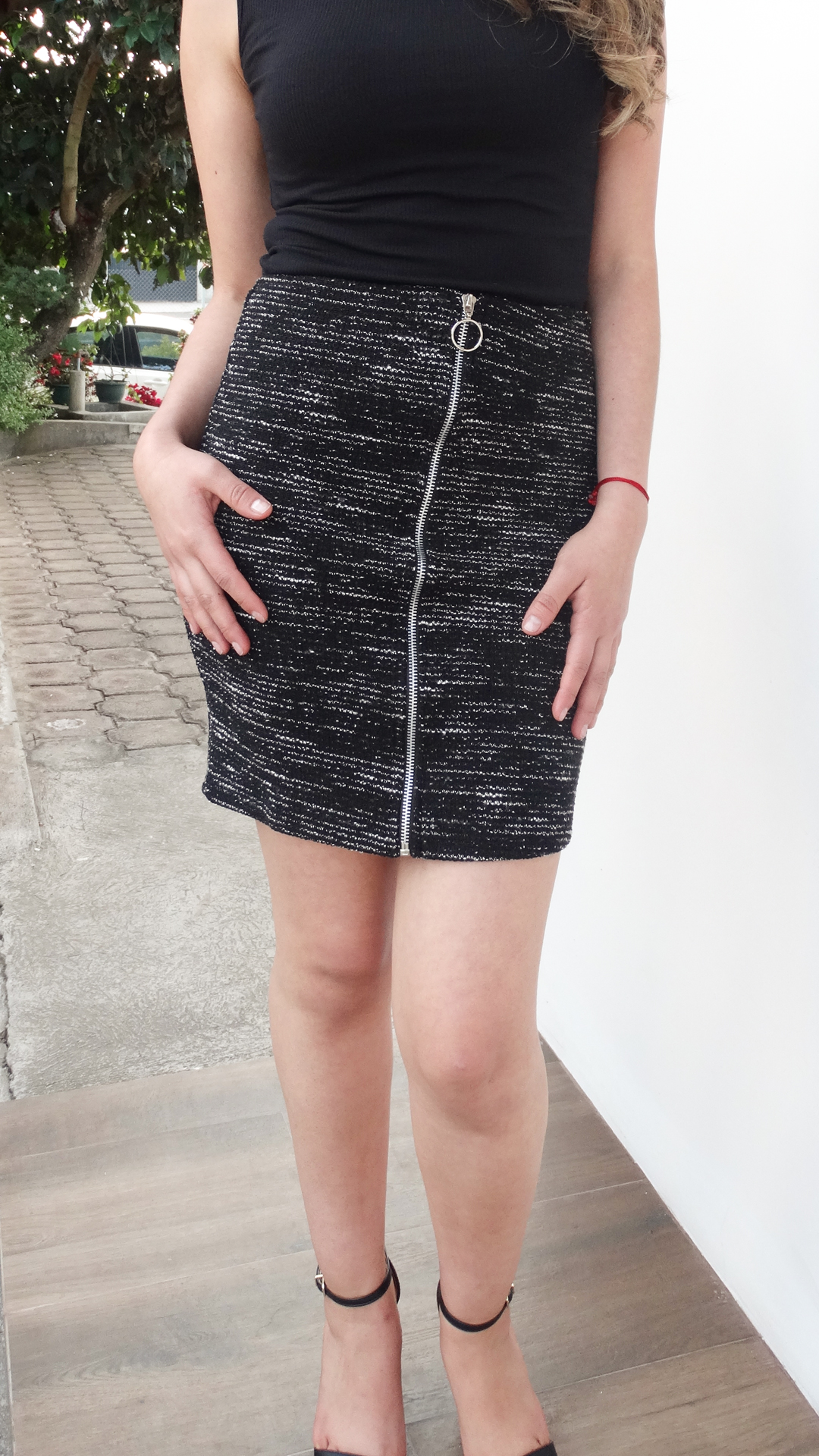 Falda corta ajustada tejido jaspeado con cierre frontal cremallera.